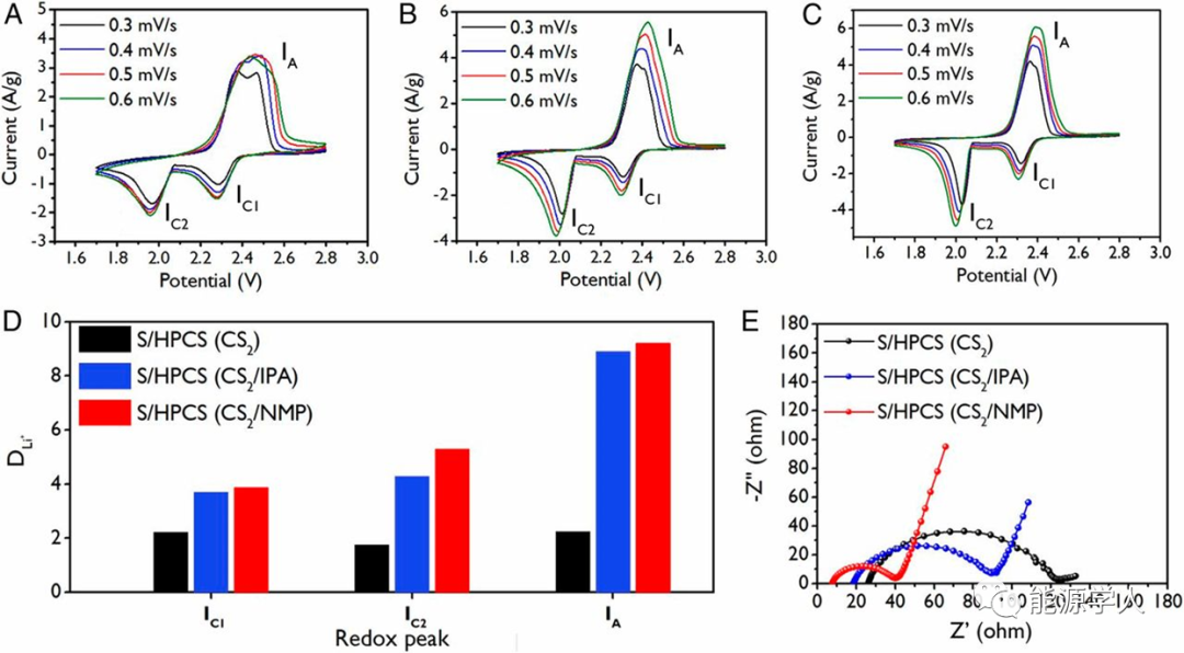 圖3(A)S/HPCS(CS2),(B)S/HPCS(CS2/IPA)和(C)S/HPCS(CS2/NMP)正極的CV圖。(D)每個正極和負(fù)極反應(yīng)的鋰離子相對擴(kuò)散速率。(E) S/HPCS(CS2)、S/HPCS(CS2/IPA)和S/HPCS(CS2/NMP)正極的Nyquist圖。