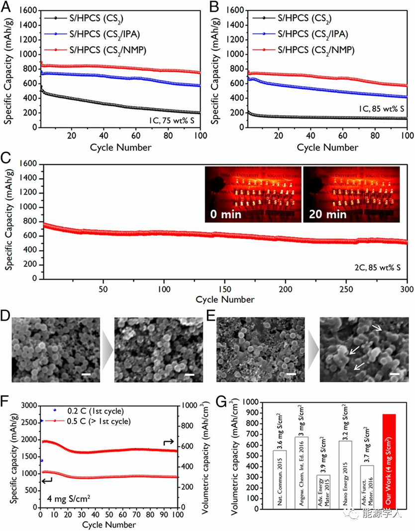 圖5(A和B)S/HPCS(CS2)、S/HPCS(CS2/IPA)和S/HPCS(CS2/NMP)電池的循環(huán)性能。(C)硫含量為85%的S/HPCS(CS2/NMP)電池在2 C下的循環(huán)性能。(D)S/H-PCS(CS2/NMP)電極和(E)S/H-PCS(CS2)電極50次循環(huán)前后的SEM圖像。(F)S/HPCS(CS2/NMP)電極在0.5 C下的比容量和容量。(G)實驗結(jié)果與使用類似硫負(fù)載的最新結(jié)果的比較。
