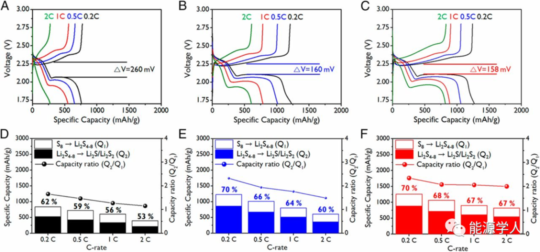圖4(A)S/HPCS(CS2),(B)S/HPCS(CS2/IPA)和(C)S/HPCS(CS2/NMP)正極的充放電曲線;(D-F)長鏈多硫轉(zhuǎn)換(Q1)和短鏈多硫轉(zhuǎn)換(Q2)的容量貢獻(xiàn)以及在不同倍率下的Q2/Q1比。