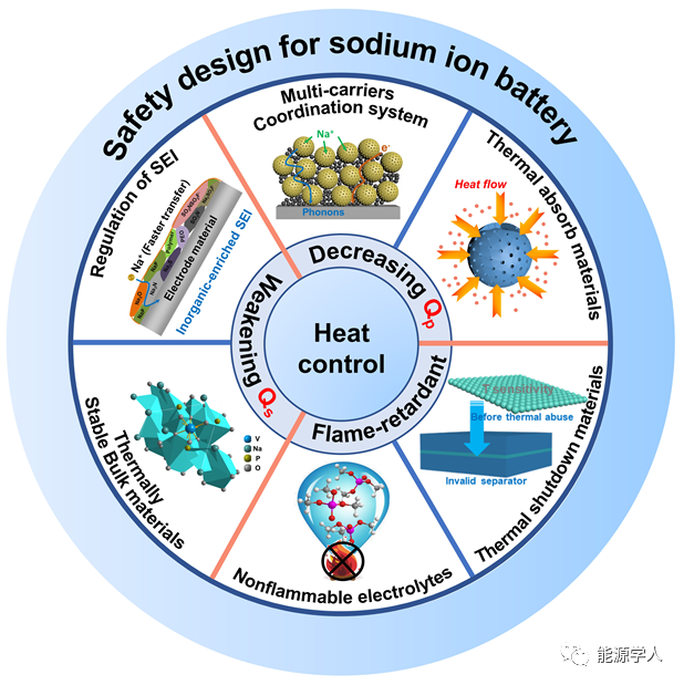 近期,武漢理工大學麥立強教授(通訊作者)和尤雅教授(通訊作者)從材料層面總結與分析了電池中主要產(chǎn)熱來源,熱失控過程引起的化學反應、衡量電池安全性的重要參數(shù),并討論了為降低熱效應電極材料的設計準則。第一作者為武漢理工大學博士研究生楊超。文章主要圍繞減少電池內(nèi)部極化熱(Qp)和副反應熱(Qs)、加快熱傳遞速率、阻燃和功能性熱保護材料做了詳細探討。該文重點關注電池的熱行為,并提出一些潛在可行的策略,這將加深對SIBs熱失控的了解,并加速熱安全體系電池材料的設計。該工作發(fā)表于材料領域期刊Advanced Energy Materials,題為“Materials Design for High-Safety Sodium-Ion Battery”。