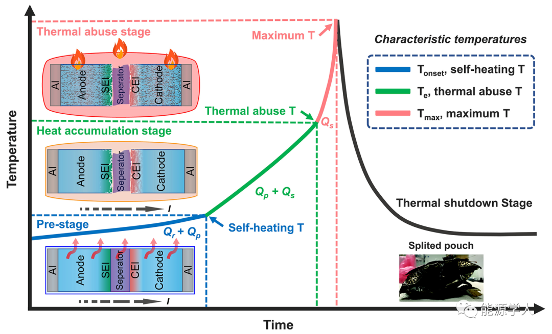圖2 鈉離子電池熱失控過程的示意圖。右下插圖顯示的是熱失控之后的燒焦的鈉離子軟包電池。