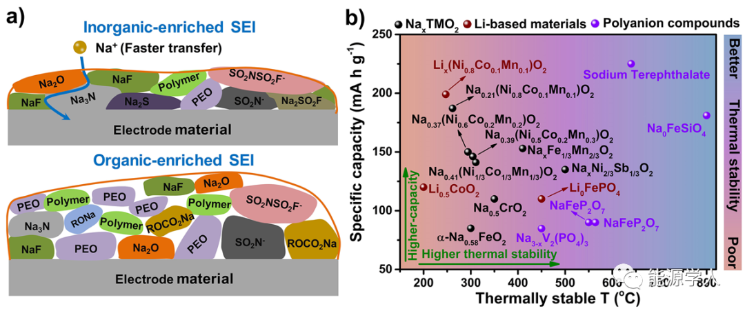 圖4 a)陽極表面無機物種富集SEI(頂部)和有機物種富集SEI的示意圖。b)各種SIBs正極材料的比容量和熱穩(wěn)定性的比較(熱穩(wěn)定性數(shù)據(jù)通過DSC測定脫鈉態(tài)材料獲得)。
