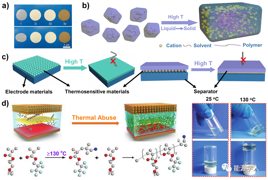 圖6 a) Celgard隔膜(i)、玻璃纖維(ii)、GF/PVDF-HFP(iii)和GF/PVDF-HFP/PDA(iv)在室溫下(頂部)和在200 °C下熱處理30分鐘(底部)后的照片。b)高溫自聚電解質(zhì)作為熱停堆材料的原理圖。c)熱響應涂層和隔膜示意圖。d)智能溫度響應電解液(PPE)在電池中的熱響應行為及其在熱濫用條件下的自由基聚合機理的示意圖,以及25°C和130°C熱濫用后PPE的光學照片。