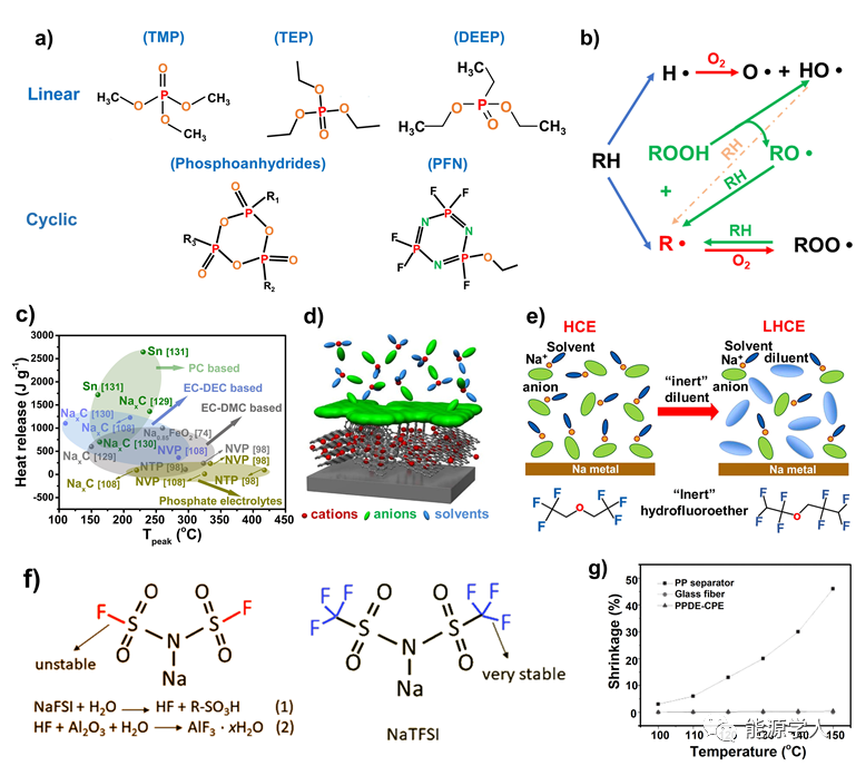 圖5 a)幾種代表性有機磷酸鹽的化學結構。b)有機磷的阻燃機理。c)在PC-/EC-DEC-/EC-DMC電解液和磷酸鹽電解液(NTP: NaTi2(PO4)3;NVP:NaV2(PO4)3)中各種電極材料的放熱溫度和總熱量。d)陽離子在阻燃的高濃電解液中插入碳質(zhì)負極的行為。e)從HCE到LHCE的稀釋過程示意圖,以及氫氟醚的代表性化學結構。f)NaFSI(左)和NaTFSI(右)的化學結構。(g)聚丙烯分離器、玻璃纖維和PPDE-CPE的熱收縮率為100至150 °C。