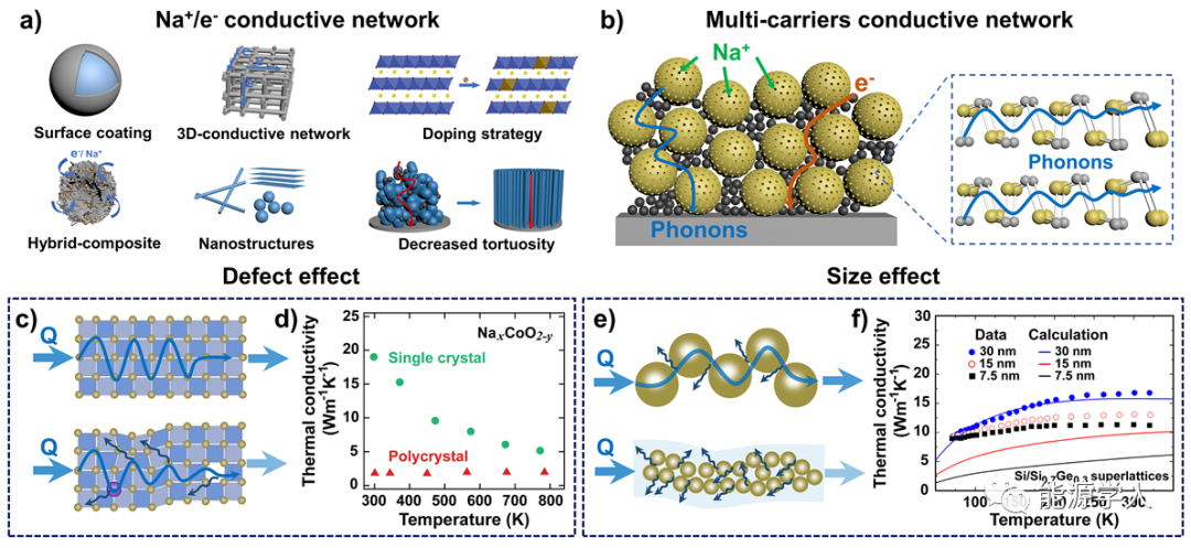 圖3 a)Na+/e-導電網(wǎng)絡構建策略的示意圖。b)多載流子導電網(wǎng)絡的示意圖,包括Na+、e-和聲子。c)完美晶格(頂部)和扭曲缺陷晶格(底部)中聲子傳輸和散射的示意圖。d)研究了NaxCoO2-y單晶和多晶樣品的熱導隨溫度的變化。e)頂部為大尺寸粒子間聲子傳輸和散射示意圖,底部為小尺寸粒子間聲子傳輸和散射示意圖。f)不同尺寸Si/SiGe超晶格的聲子熱導率。