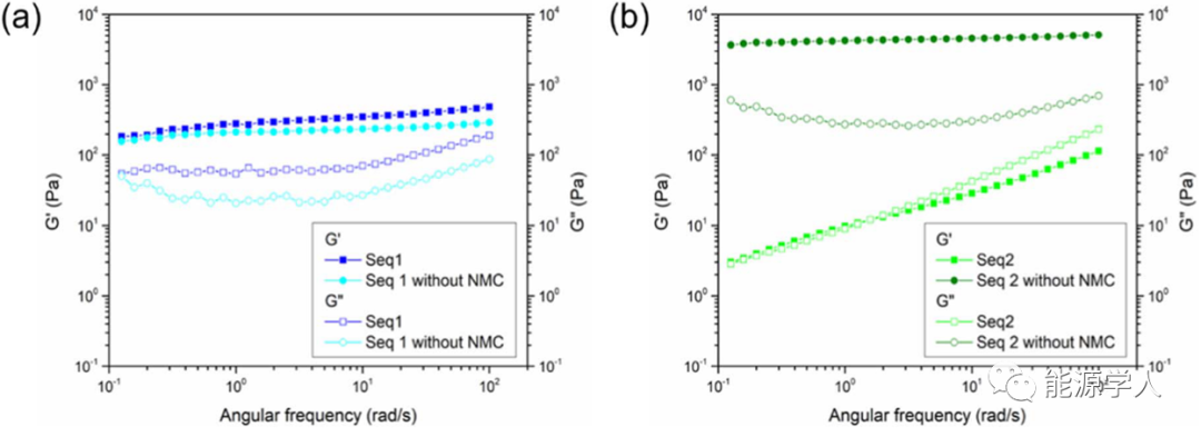1)在順序1中的第二次混合過(guò)程中,CB納米顆粒分首先和PVDF纖維結(jié)合形成穩(wěn)定的凝膠,再與加入的NMC顆粒發(fā)生強(qiáng)相互作用,凝膠結(jié)構(gòu)得以保留。