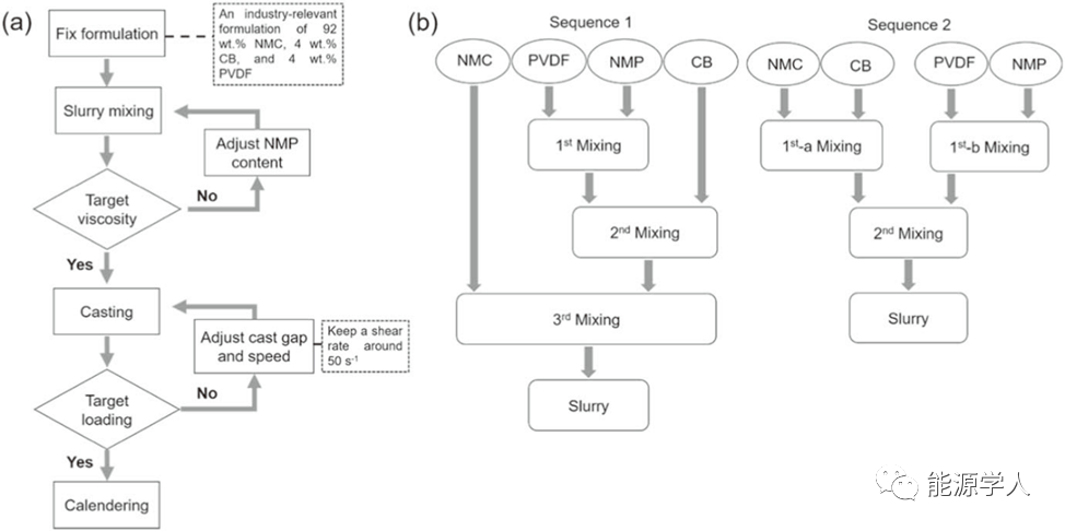 圖1.(a)電極制造過(guò)程的優(yōu)化策略。(b)制備電極漿料的混合順序1和順序2的示意圖