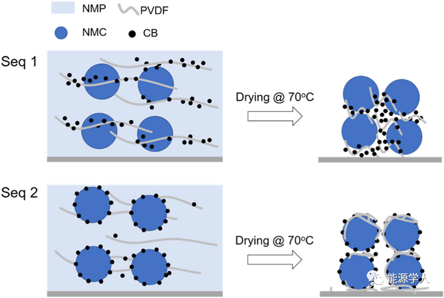 因此,順序1制成的漿料的“強(qiáng)度”由PVDF鏈的纏結(jié)和CB的填充效應(yīng)共同提供。順序2制成的漿料的“強(qiáng)度”主要由PVDF鏈的纏結(jié)提供。導(dǎo)致順序2制成的漿料流動(dòng)性較好。在干燥過(guò)程中,使用順序1制得的漿料隨著NMP的蒸發(fā),CB納米顆粒被捕集在PVDF聚合物基質(zhì)中,形成了填充NMC顆粒之間空間的多孔CB/PVDF簇。在干燥使用順序2制得的漿料時(shí),附著在NMC顆粒上的CB納米顆粒會(huì)吸收PVDF,從而在NMC顆粒上形成致密的CB/PVDF層。