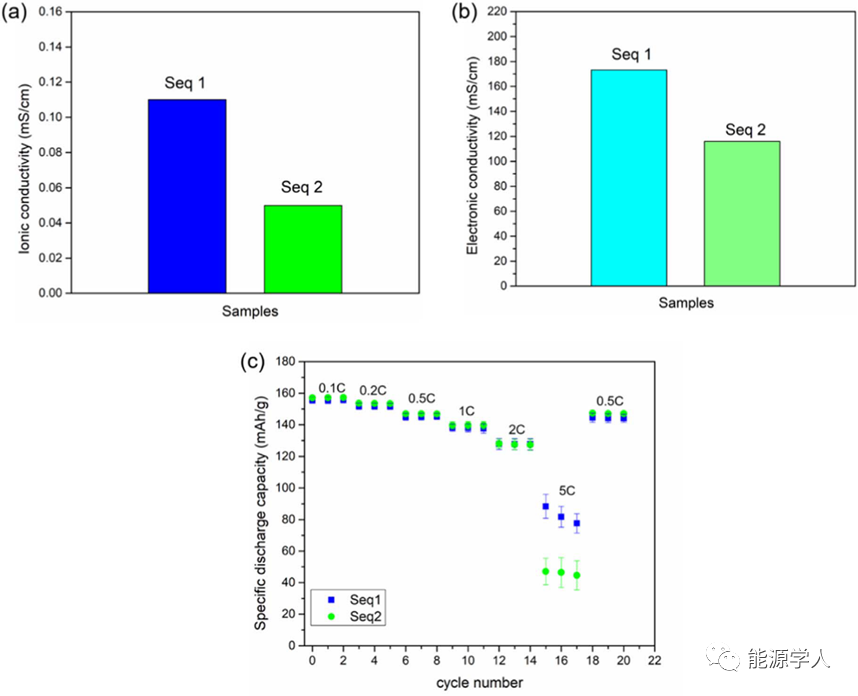 圖6. 兩種順序制備電極的(a)離子電導(dǎo)率,(b)電子電導(dǎo)率和(c)倍率性能