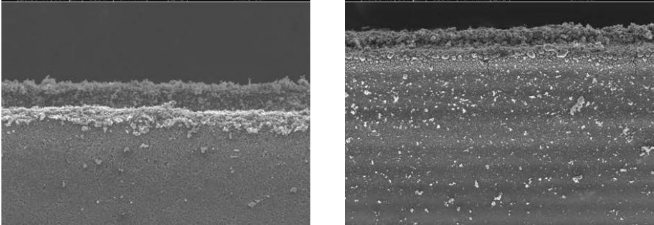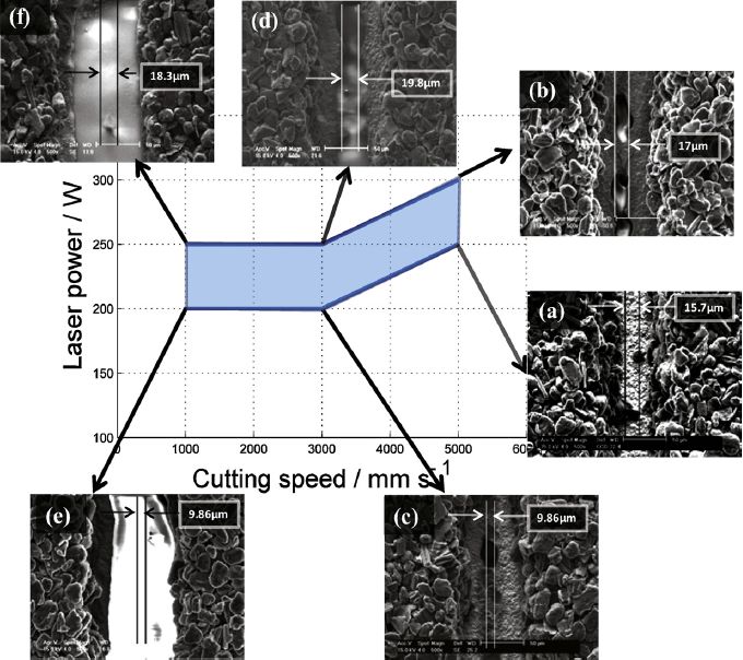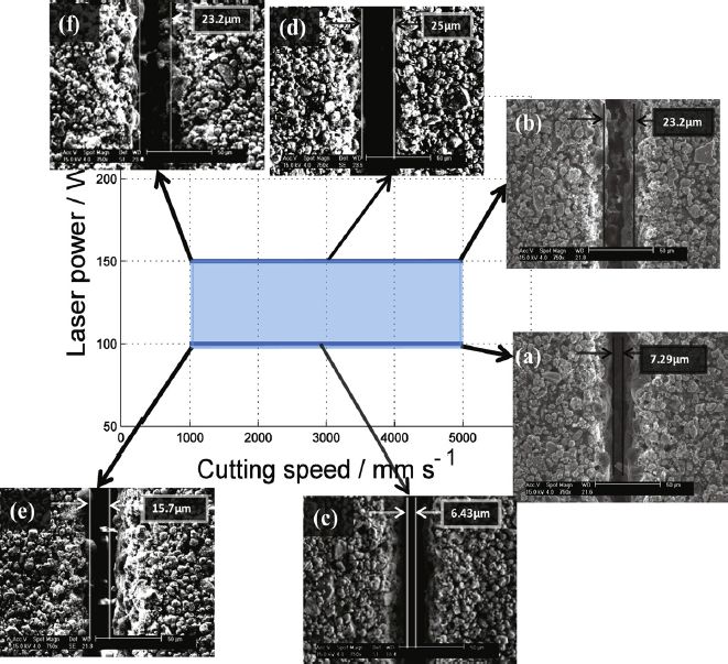 其中,激光能量和切割移動(dòng)速度是兩個(gè)主要的工藝參數(shù),對(duì)切割質(zhì)量影響巨大。圖5是不同的激光切割工藝條件下單面涂層負(fù)極極片的切邊形貌,圖6是不同的激光切割工藝條件下單面涂層正極極片的切邊形貌。當(dāng)激光功率太低或者移動(dòng)速度太快時(shí),極片不能完全切開,而當(dāng)功率太高或移動(dòng)速度太低時(shí),激光對(duì)材料作用區(qū)域變大,切縫尺寸更大。