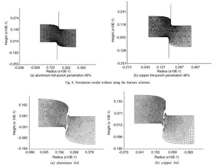 其中,模具磨損過(guò)程簡(jiǎn)化為圖4a所示,模具磨損量用a和b表示,當(dāng)發(fā)生磨損時(shí),隨著a、b值變化,當(dāng)模具發(fā)生磨損時(shí),有效沖切間隙Cle也會(huì)相應(yīng)增加,如圖4b所示,有效間隙滿足式(2)關(guān)系。沖切間隙和模具刃口的磨損情況對(duì)沖切過(guò)程有重要影響,隨著模具的磨損,沖切間隙增加,模具刃口圓角增大,沖切件的斷面質(zhì)量也會(huì)發(fā)生改變。
