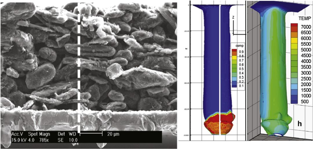 由于鋰離子電池極片是雙面涂層+中間集流體金屬層的結(jié)構(gòu),而且涂層與金屬箔材之間性質(zhì)差異大,對(duì)激光作用的響應(yīng)也不相同。激光作用在負(fù)極石墨層或正極活物質(zhì)層時(shí),由于它們具有很高的激光吸收率,導(dǎo)熱系數(shù)也很低,因此,涂層需要相對(duì)較低的熔化和汽化激光能量,而金屬集流體對(duì)激光具有反射作用,并且熱傳導(dǎo)快,因此金屬層的熔化和汽化激光能量升高。圖7是單面涂層的負(fù)極在激光作用下極片厚度方向的銅成分和溫度分布,當(dāng)激光作用在石墨層時(shí),由于材料的特性,石墨主要發(fā)生汽化,當(dāng)激光侵入到金屬銅箔時(shí),銅箔開始發(fā)生熔化,形成熔池。工藝參數(shù)不合適時(shí),可能出現(xiàn)問(wèn)題:(1)切邊涂層脫落,露出金屬箔材,如圖8左圖所示;(2)切邊周圍出現(xiàn)大量切屑異物。這些都會(huì)導(dǎo)致電池出現(xiàn)性能下降、安全性品質(zhì)問(wèn)題,如圖8右圖所示。因此,當(dāng)采用激光切割時(shí),需要根據(jù)活物質(zhì)材料和金屬箔材的特性,優(yōu)化合適的工藝參數(shù),才能既完全切割極片,又形成良好的切邊質(zhì)量,不產(chǎn)生金屬切屑雜質(zhì)殘留。